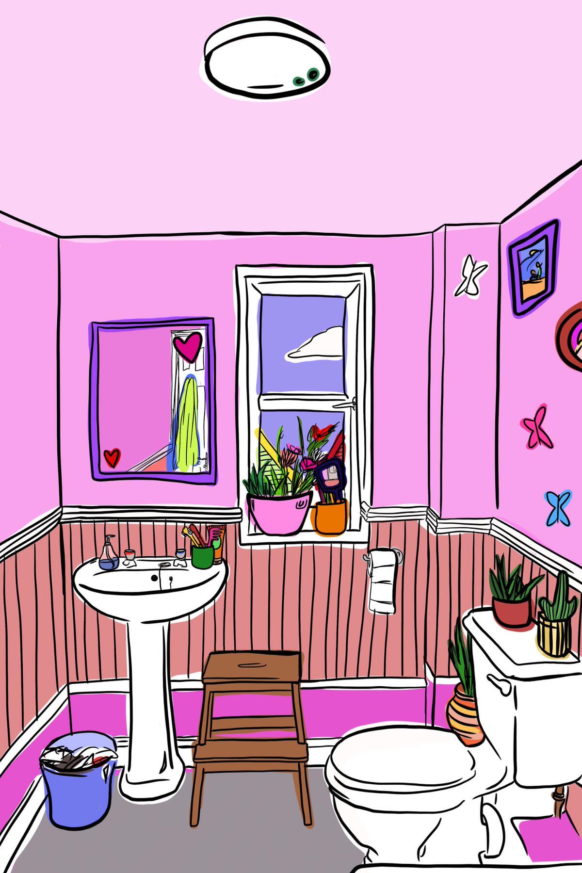 After visiting the Pink House's kitchen you're most likely going to need to use the bathroom!! The first-floor bathroom is one of a kind! it has a flushing toilet, a sink, a garbage can, and even a smoke detector (don't worry though! it is broken you can still smoke in here)